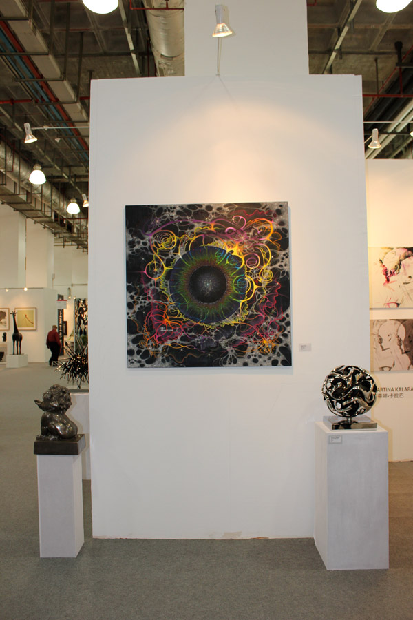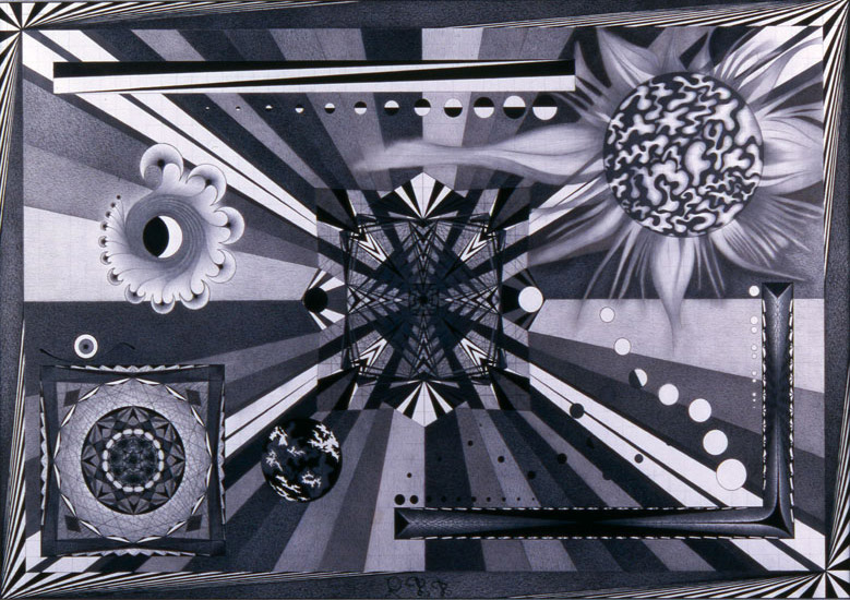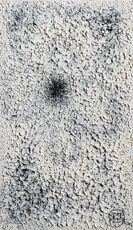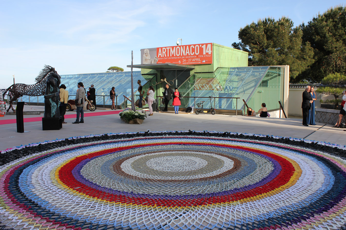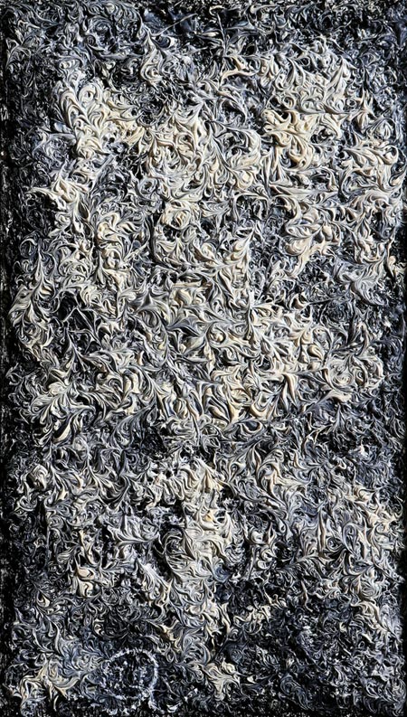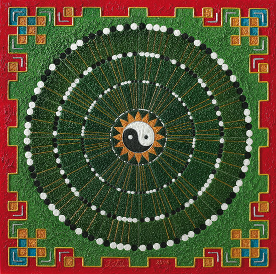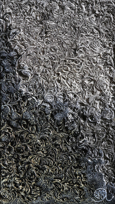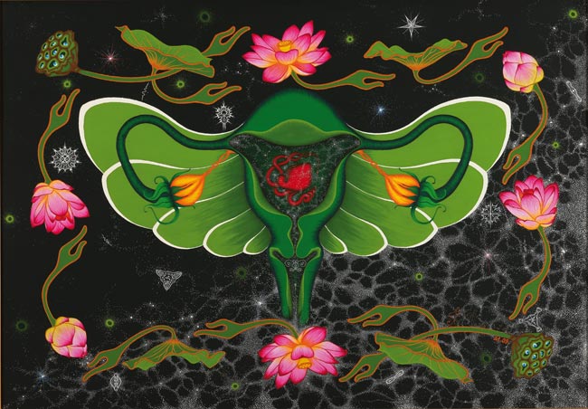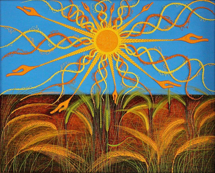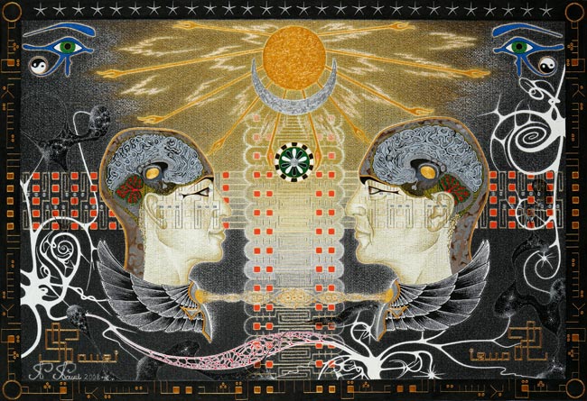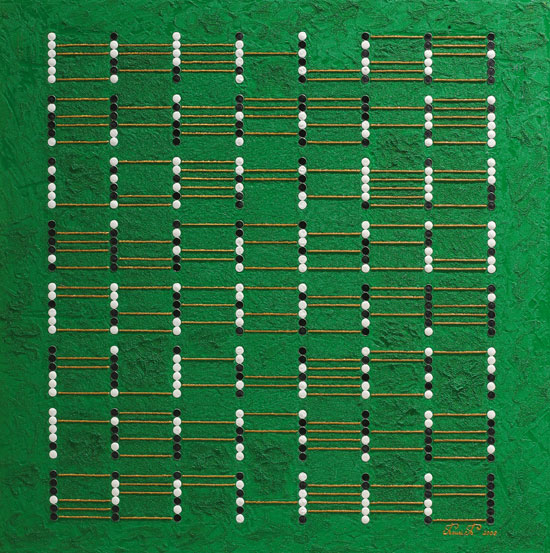 Mehrfach zitiert sie die genetische Kette, um darzustellen, auf welch verschlungene und unauflösliche Weise der Ursprung des Menschen mit der Natur und mit dem ganzen Kosmos verbunden ist. Auch wenn es sich um größere Formate handelt, arbeitet sie mit millimetergenauer Exaktheit. Nichts bleibt dem Zufall überlassen, auch das kleinste Detail wird zur sinnvoll gestalteten Miniatur.