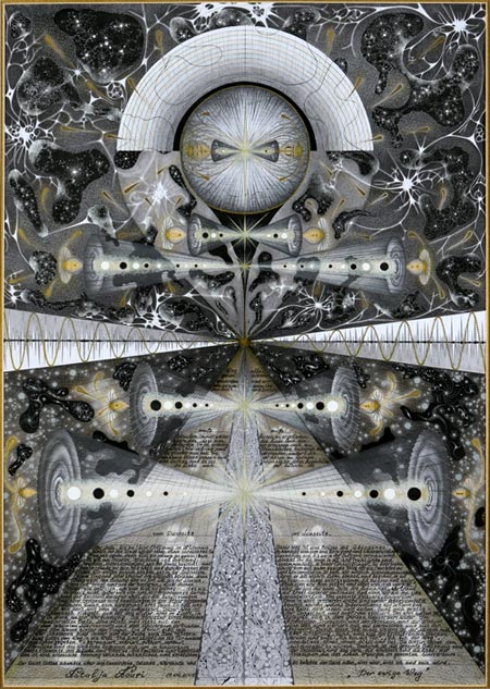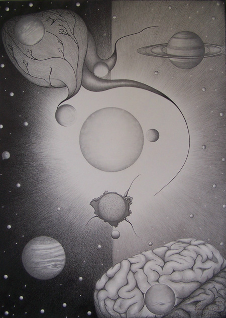 Sie geht ihren eigenen Weg, gehört keiner Schule an. Die Motive, Themen und gestalterischen Aufgaben, die sie sich setzt, zielen auf das große Ganze, auf das, was die Welt im Innersten zusammenhält, auf die verborgenen Zusammenhänge zwischen Makro- und Mikrokosmos. Natalja Nouri zeichnet Mikroorganismen, die Galaxien gleichen, um die Einheit von Mikro- und Makrokosmos sinnfällig ins Bild zu setzen.